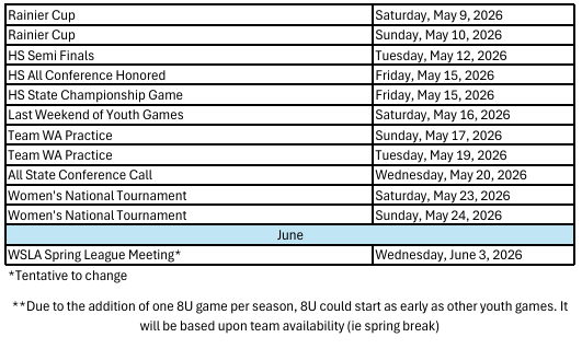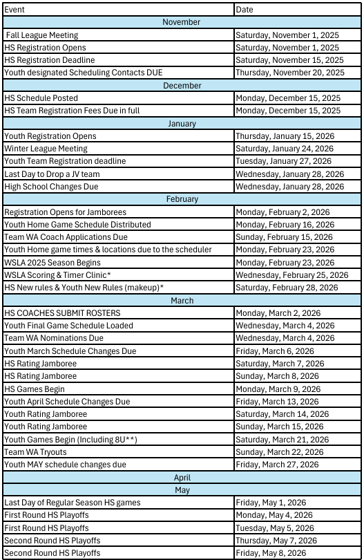 | Dates | Begins the first day of pratice & ends the final day of WSLA sponsored games. (Typically late February through mid-May) | End of In-Season until Labor day | The day after Labor Day until the beginning of In-Season** | MLK Day to the beginning of In-Season |