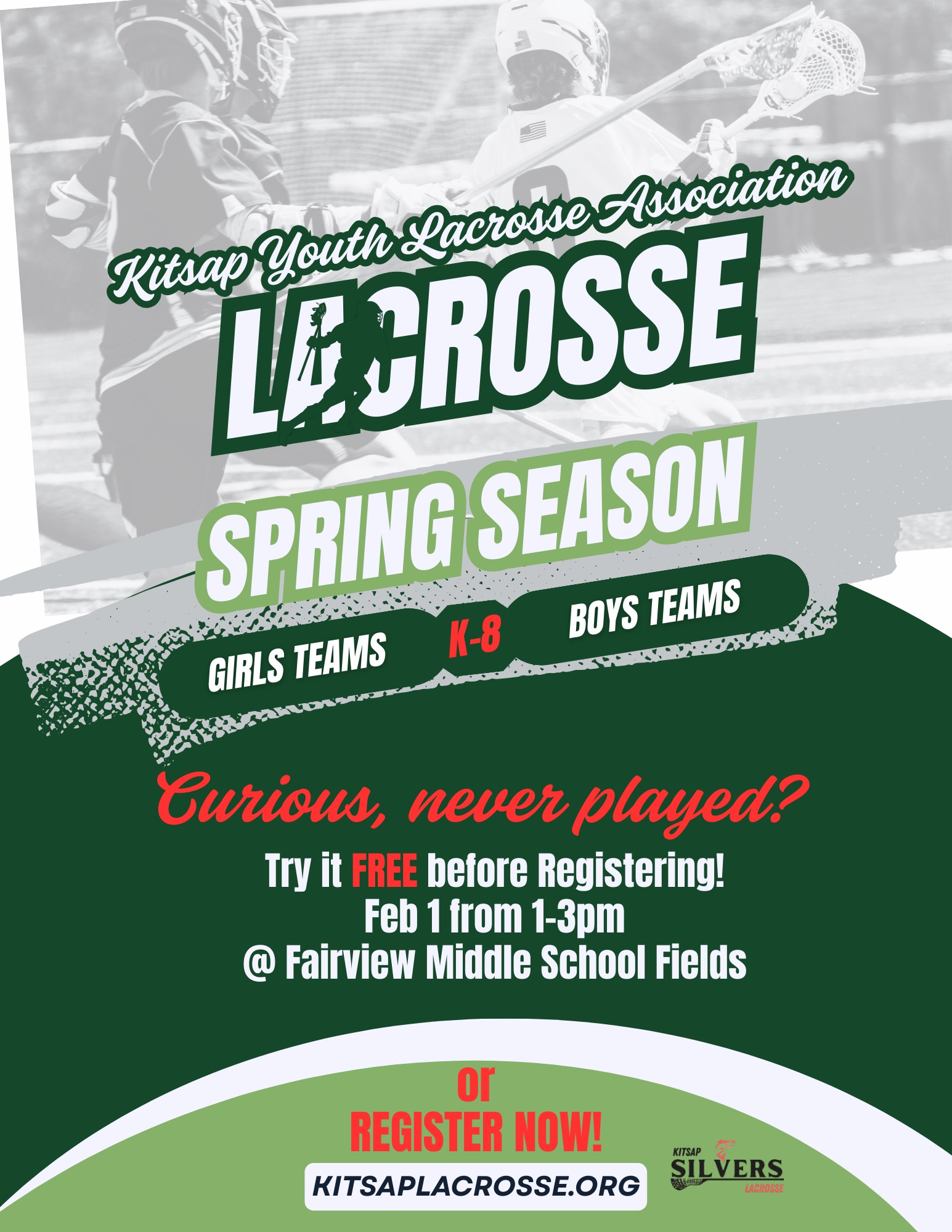 Sunday, February 1st Silverdate, WA Try Lacrosse Boys & Girls www.kitsaplacrosse.org
