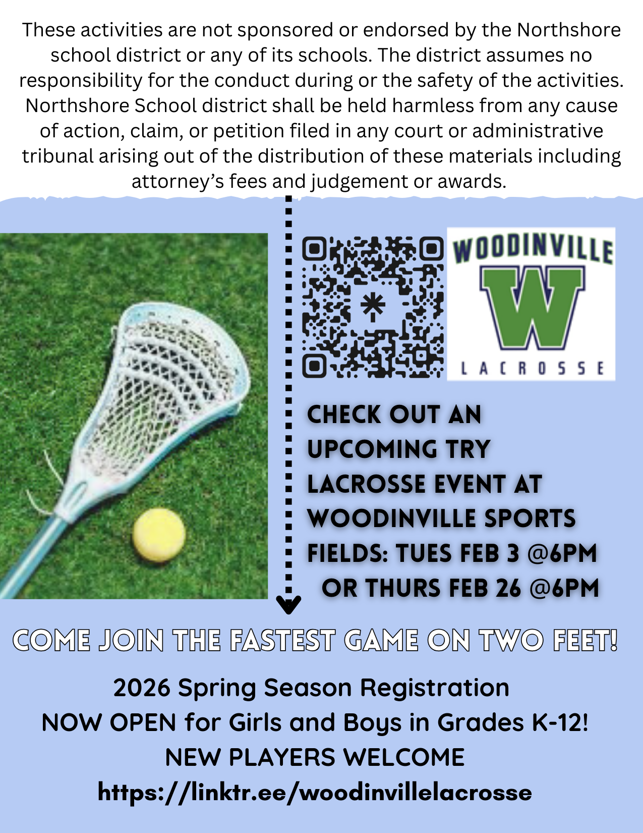Tuesday, February 3rd Woodinville, WA Try Lacrosse Boys & Girls https://www.woodinvillegirlslacrosse.com/