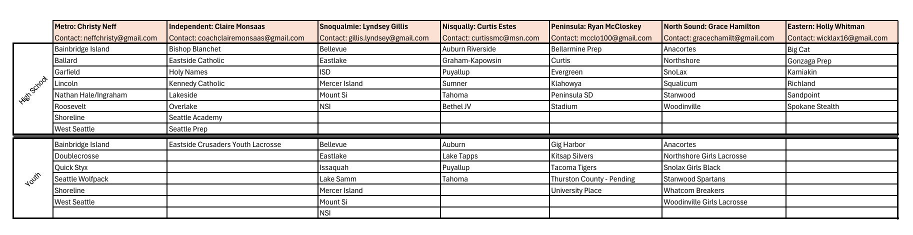 | Snoqualmie | Lyndsey Gillis | gillis.lyndsey@gmail.com |