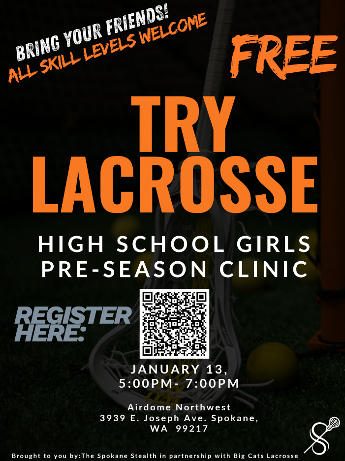 | January 13th, 2025 | Spokane, WA | Try Lacrosse Clinic | https://docs.google.com/forms/d/e/1FAIpQLSd_4TneOqByTtO1V1rQSTHTqUiih9BMPN10bvpboNumLLU72Q/viewform?pli=1 |
