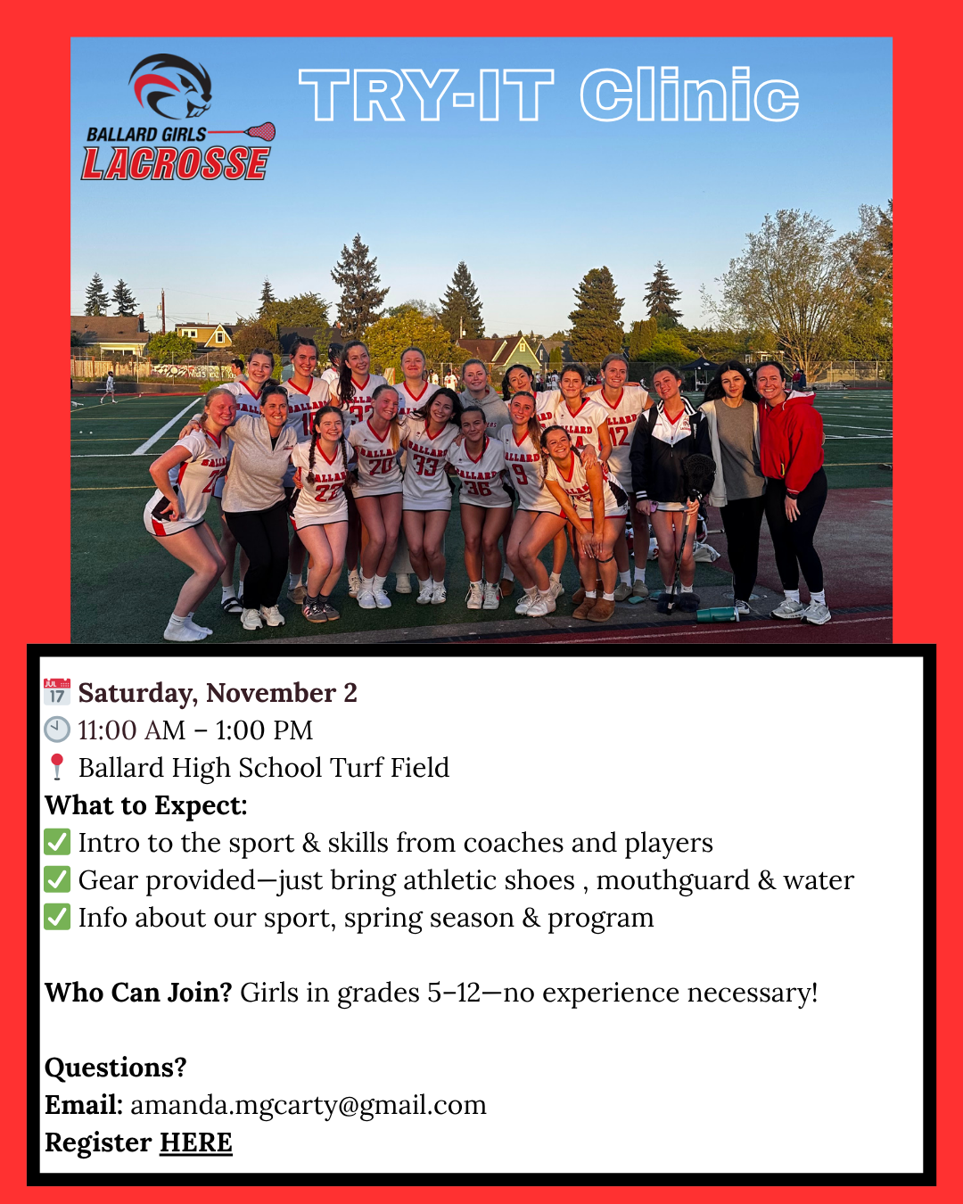 | 11/2/2025 | Ballard, WA | Try-It Clinic | https://account.usalacrosse.com/event/view/2b07011b-e7df-4e8a-9474-1cba568b8e55 |