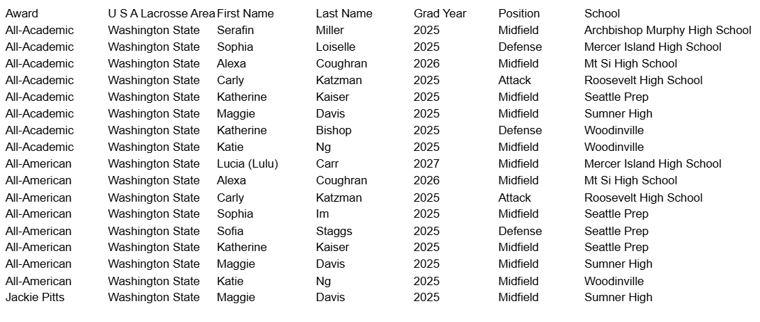 - All Academic (8 players total from Washington will be recognized; must be a junior or senior)